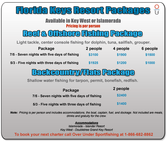 Over Under Sportfishing has put together some great Florida Fishing Packages in three great fishing destinations. In Islamorada, considered the “Sportfishing Capital of the World” we have teamed up with the Islander Resort. In Key West & Fort Lauderdale, the Hilton Doubletree will accommodate our fishing guests! We can accommodate corporate groups, bachelor parties, family outings and serious fishermen. Choose from Florida Fishing packages from three to seven nights. Check out some of our sample fishing packages below. Or let OU put together a package just for you and your group!
